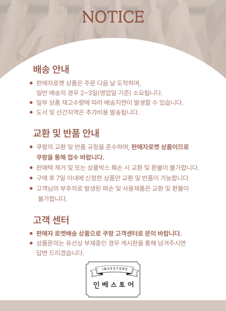 - ㆍ모니터 해상도의 차이로 인해 색상이나 이미지가 실제와 달라, 고객이 단순 변심으로 교환/반품을 무료로 요청하는 경우