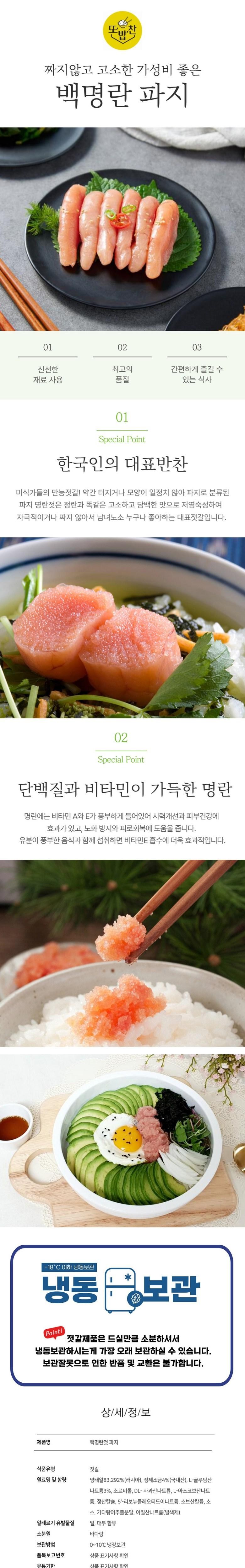| 포장단위별 내용물의 용량(중량), 수량 | 상품 상세페이지 참조 | 원재료명 및 함량 | 명태알83.292%(러시아), 정제소금4%(국내산), L-글루탐산나트륨3%, 소르비톨, DL- 사과산나트륨, L-아스코브산나트륨, 젖산칼슘, 5'-리보뉴클레오티드이나트륨, 소브산칼륨, 소스, 가다랑어추출분말, 아질산나트륨(발색제) |