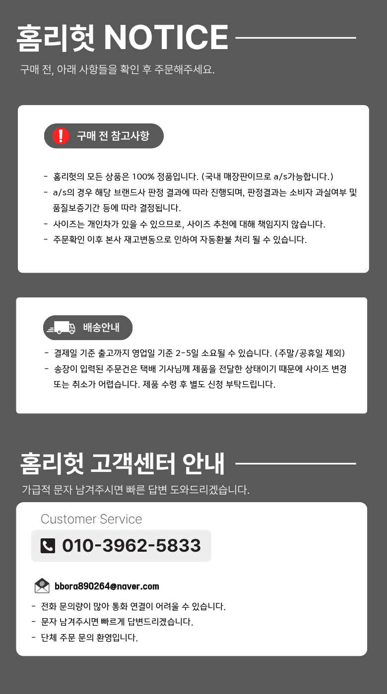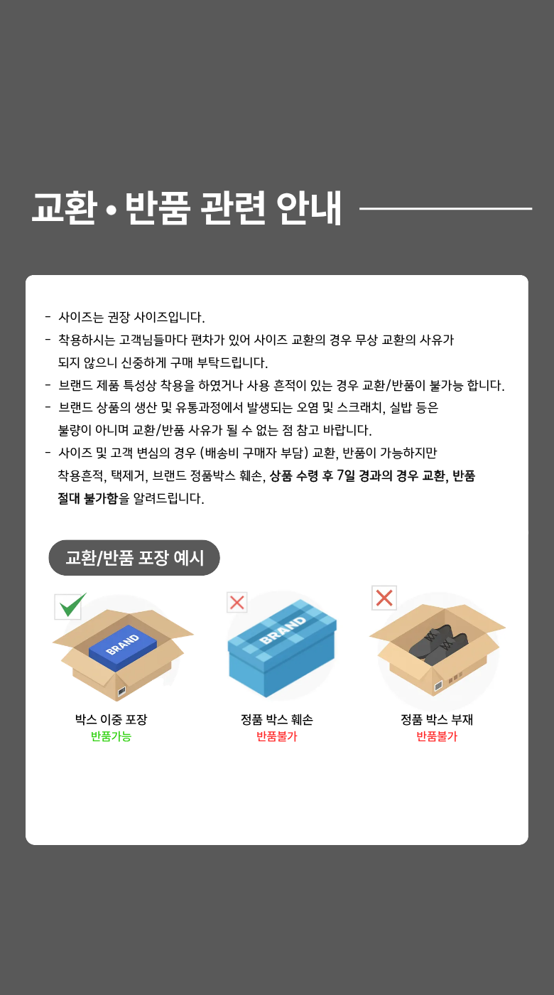 | 교환/반품 비용 (왕복비용) | 10,000원 - 단, 고객 변심의 경우에만 발생 - 도서산간 지역 배송불가 |