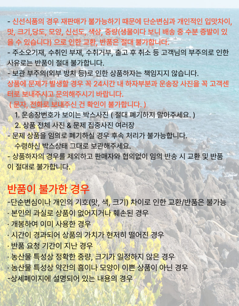 - ㆍ모니터 해상도의 차이로 인해 색상이나 이미지가 실제와 달라, 고객이 단순 변심으로 교환/반품을 무료로 요청하는 경우