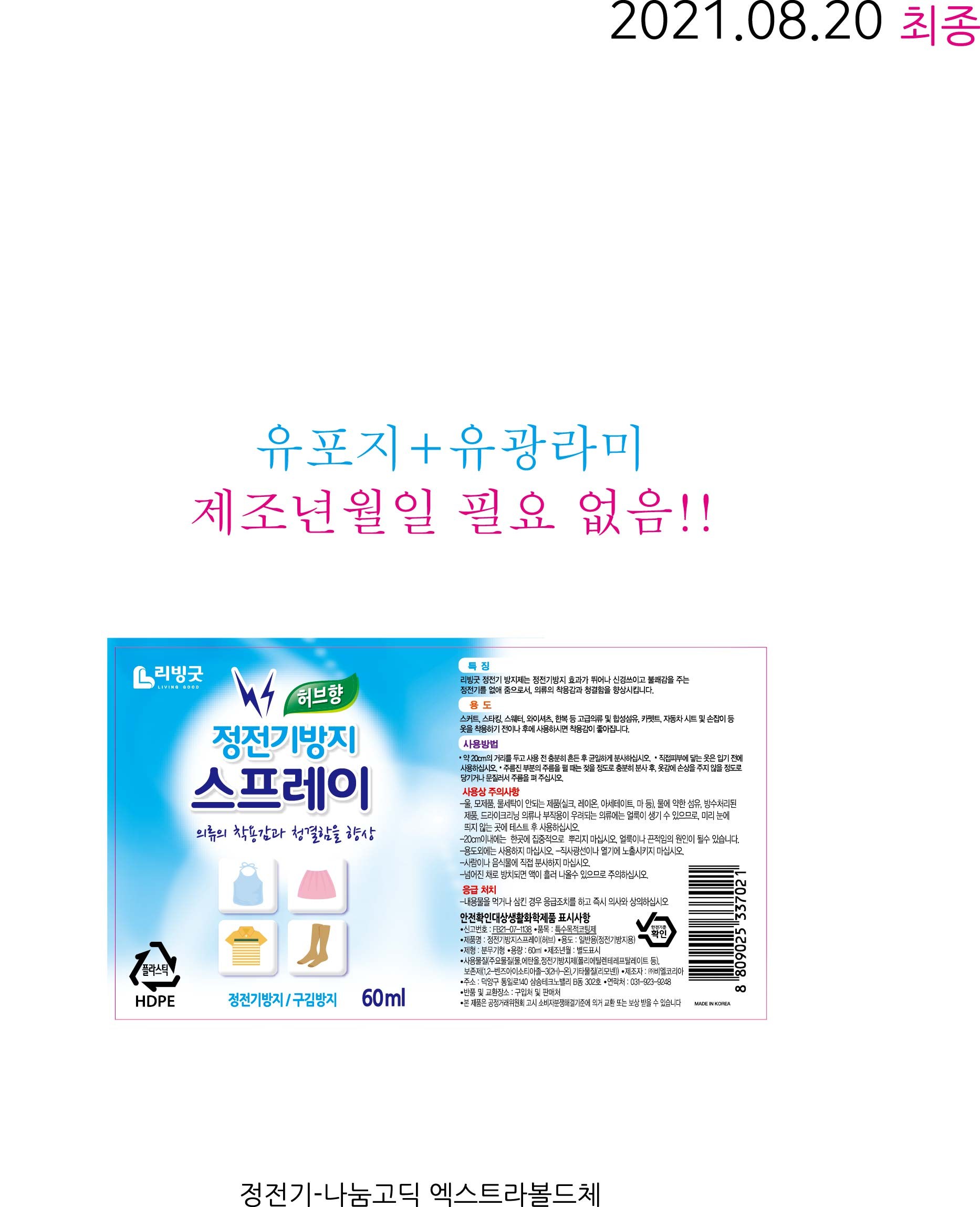 | 품목 및 제품명 | 특수목적코팅제 / 정전기방지스프레이(허브) | 용도(표백제의 경우 계열을 함께표시) 및 제형 | 일반용-정전기방지용 / 분사형-분무기형 |