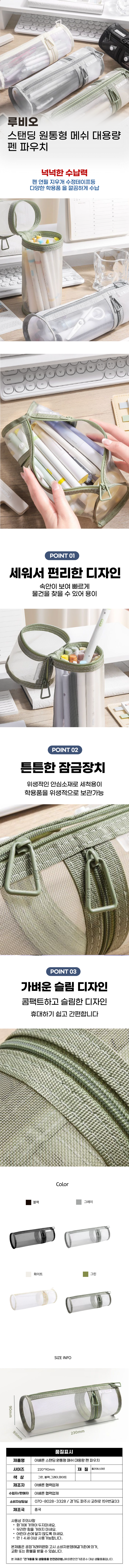 | 품명 및 모델명 | 루비오 깔끔한 스탠딩 원통형 메쉬 필통 대용량 펜 파우치 | 인증/허가 사항 | 해당없음(14세이상) |