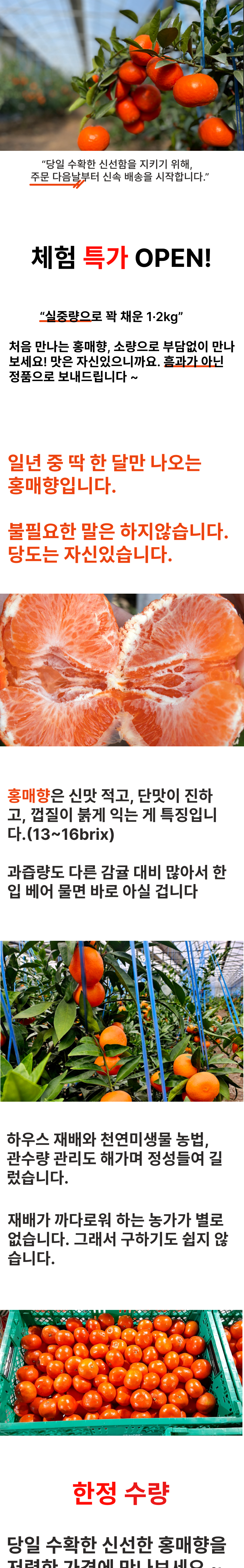| 품목 또는 명칭 | [한정수량] 제주 홍매향 홍미향 동백향 미하야 썬레드 | 포장단위별 내용물의 용량(중량),수량,크기 | 1kg 2kg 3kg 5kg |