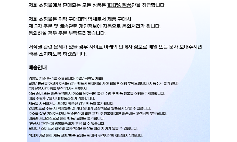 - ㆍ모니터 해상도의 차이로 인해 색상이나 이미지가 실제와 달라, 고객이 단순 변심으로 교환/반품을 무료로 요청하는 경우