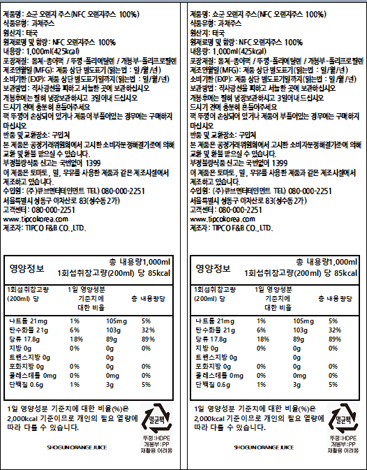 | 포장단위별 내용물의 용량(중량), 수량 | 1L, 4개 | 원재료명 및 함량 | 컨텐츠 참조 |