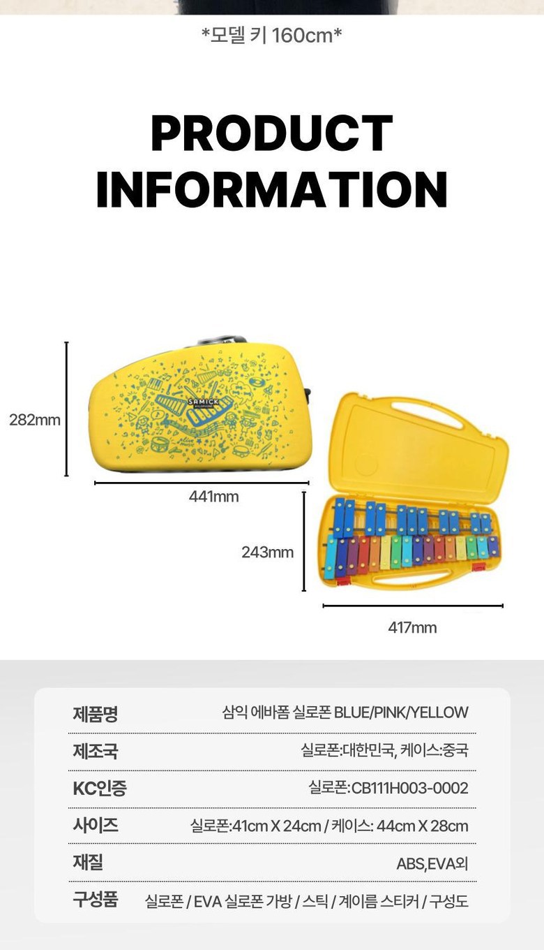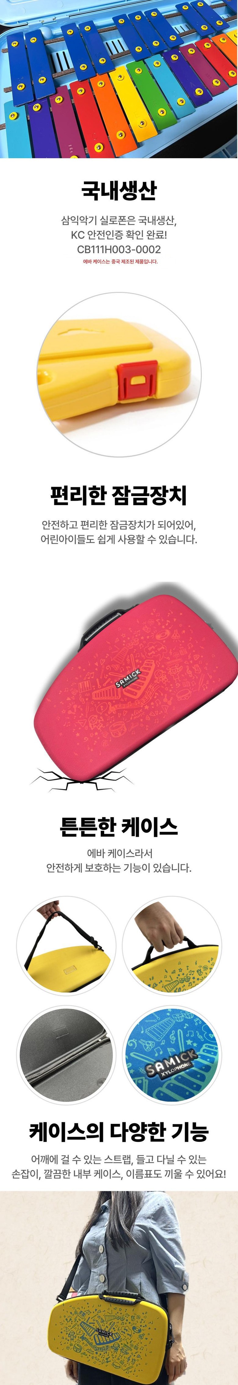 | 품명 및 모델명 | 삼익악기 실로폰 NSX-E27 27판 프리미엄 에바 케이스 글로켄슈필 27판 옐로우 1개 | KC 인증정보 | 실로폰: CB111H003-0002 , 케이스, 스티커: 해당없음(14세 이상) |