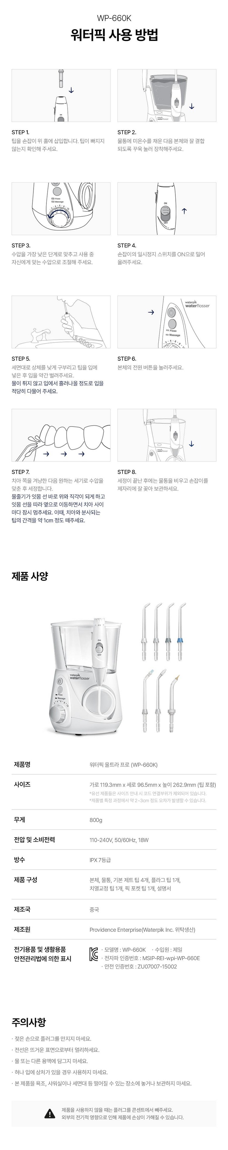 | 품명 및 모델명 | 워터픽 울트라 프로 WP-660K | KC 인증정보 | ZU07007-15002 |