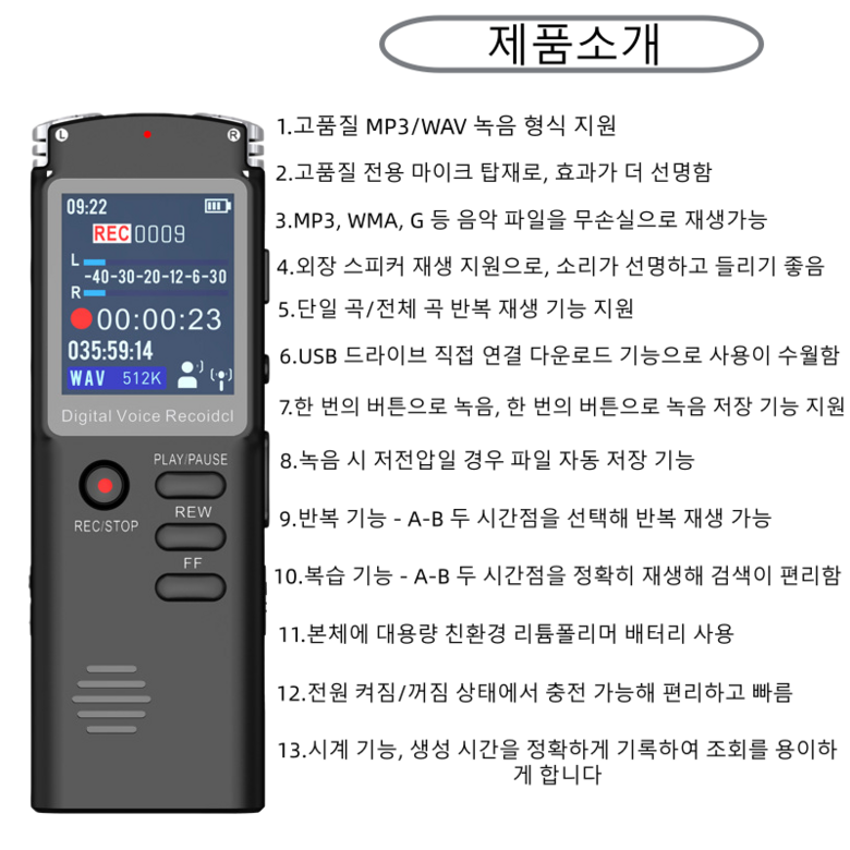 HOMIE 고성능 녹음기 고음질디지털 녹음음악 재생가능 8GB용량