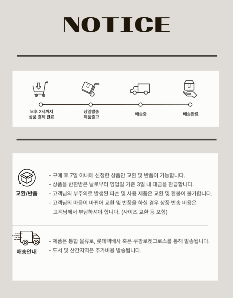 - ㆍ모니터 해상도의 차이로 인해 색상이나 이미지가 실제와 달라, 고객이 단순 변심으로 교환/반품을 무료로 요청하는 경우