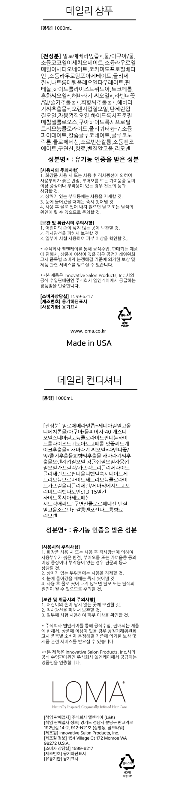 | 사용기한 또는 개봉 후 사용기간 | 본 상품은 해당 물류센터 직발송 상품인 관계로 제조연월일 및 사용기한 정보가 매번 변경되므로 상단 사용기한 정보를 참고해 주세요. | 사용방법 | 샴푸: 적당량을 손에 덜어 모발과 두피에 가볍게 문지른 뒤 물로 씻어내 주세요. | 컨디셔너: 샴푸 후 적당량을 두피를 제외한 모발에 도포한 후 충분히 헹구어 냅니다. |
