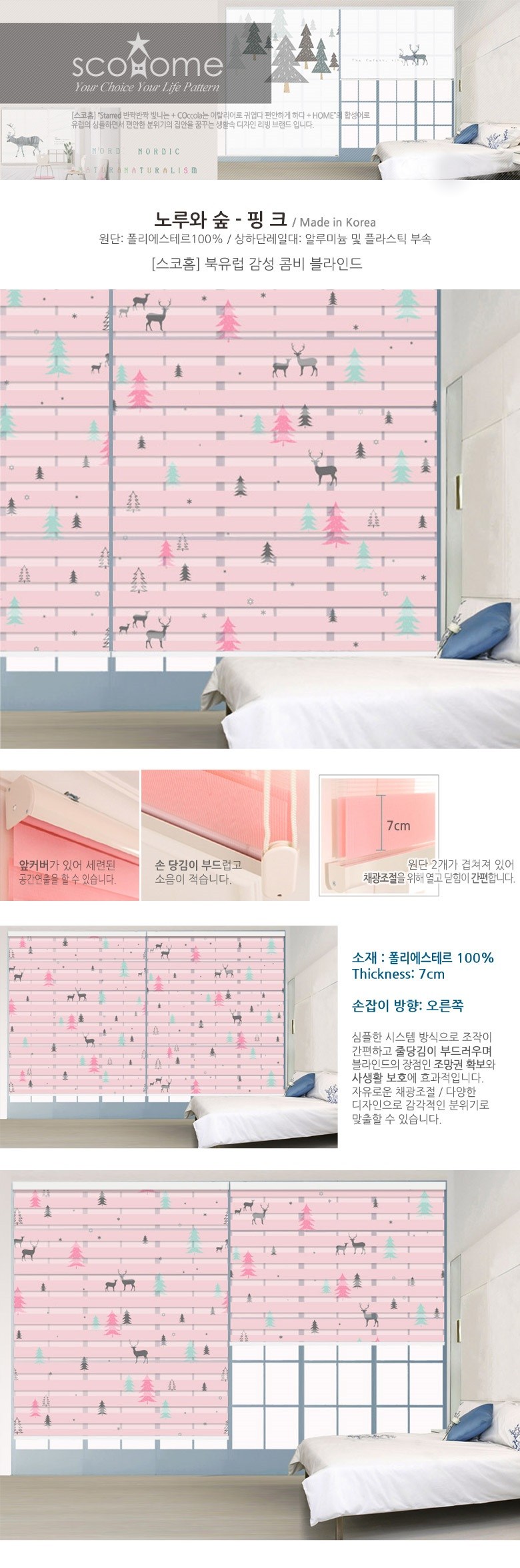 | 제품 소재 | 원단: 폴리에스테르100% / 상하단레일대: 알루미늄 및 플라스틱 부속 | 색상 | 핑크 |