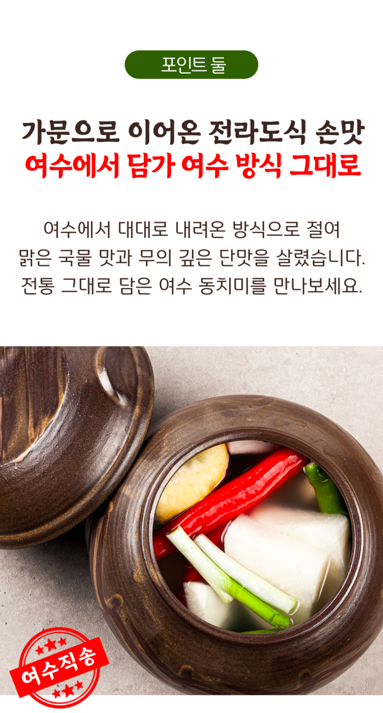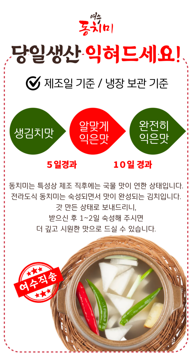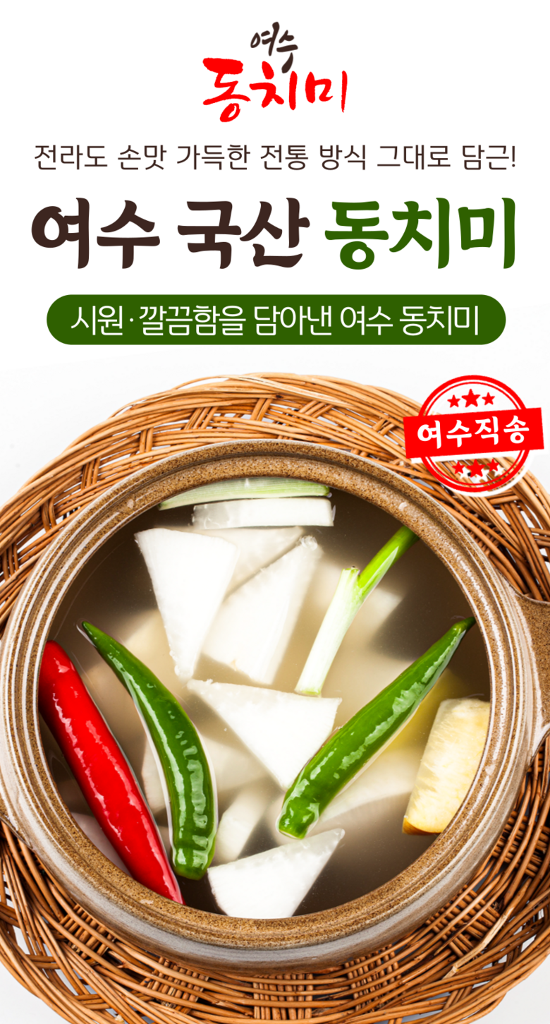 | 품목 또는 명칭 | 여수 동치미 | 포장단위별 내용물의 용량(중량),수량,크기 | 5kg |