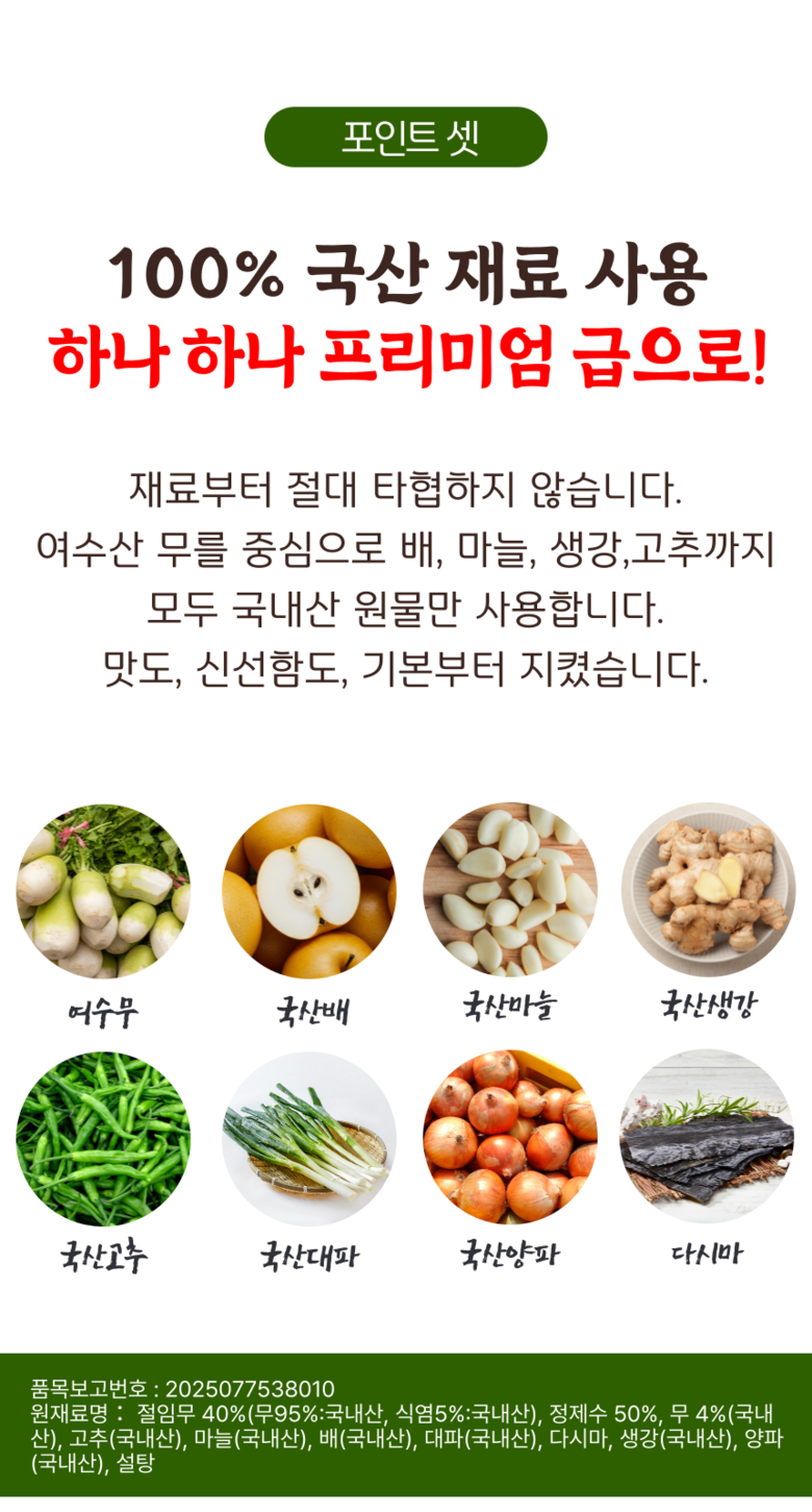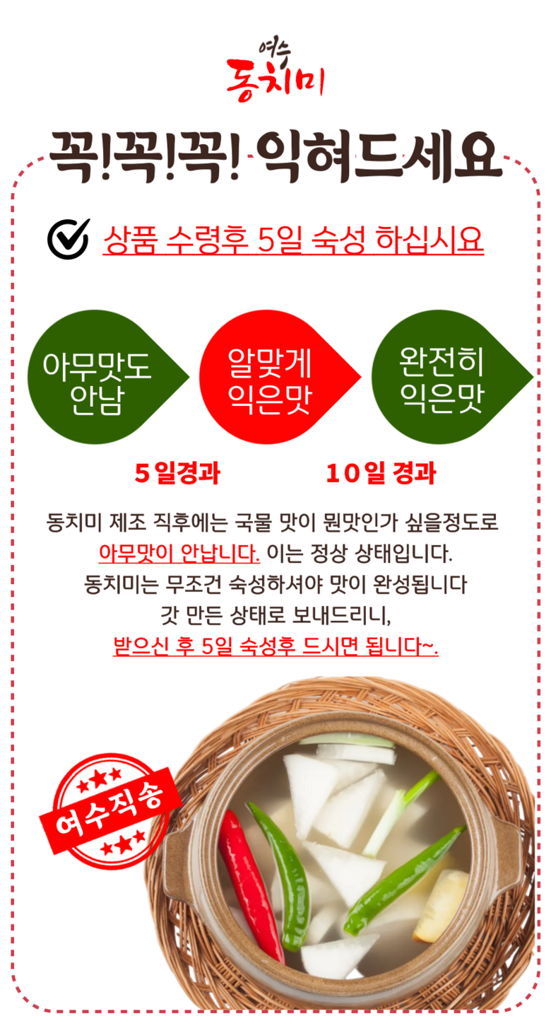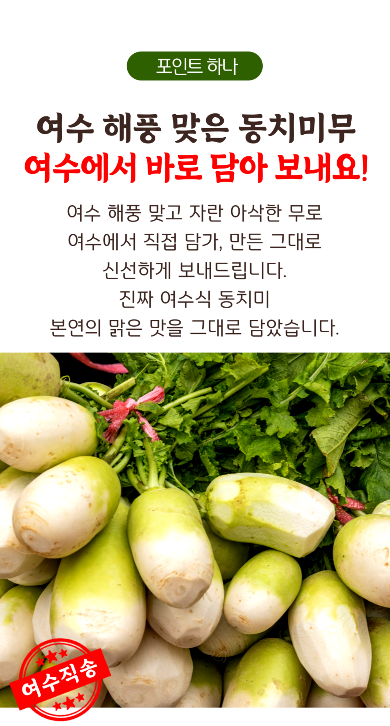| 품목 또는 명칭 | 여수 동치미 | 포장단위별 내용물의 용량(중량),수량,크기 | 5kg |