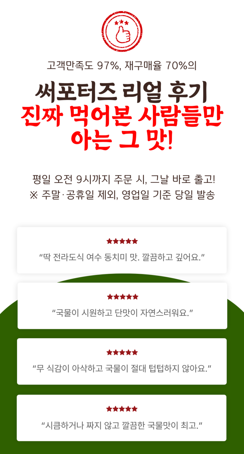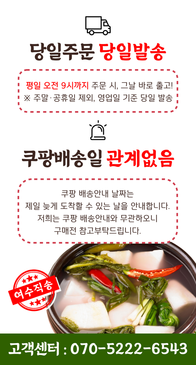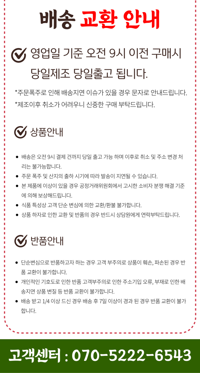 | 배송방법 | 신선/냉장/냉동 | 배송비 | 무료배송 - 도서산간 지역 배송불가 |