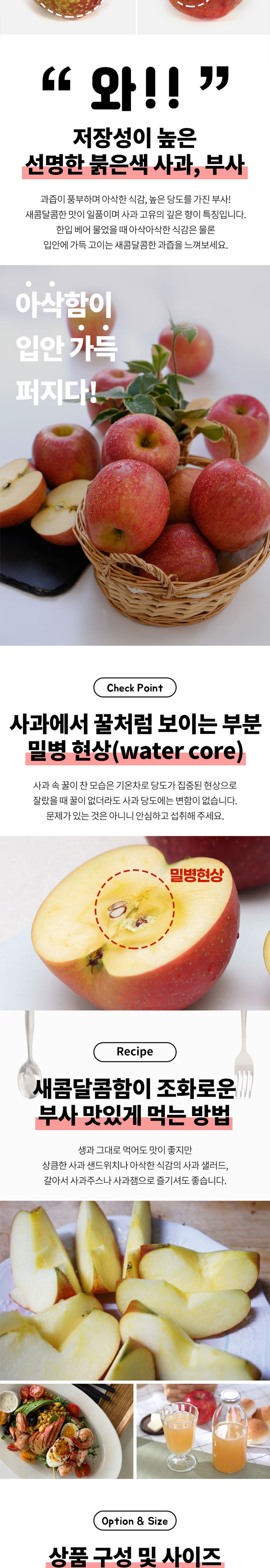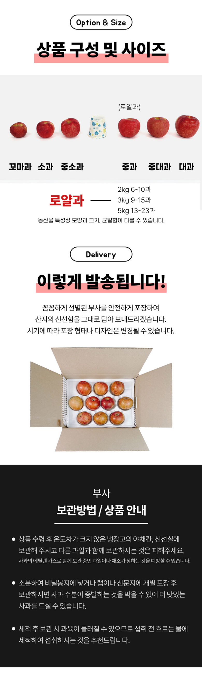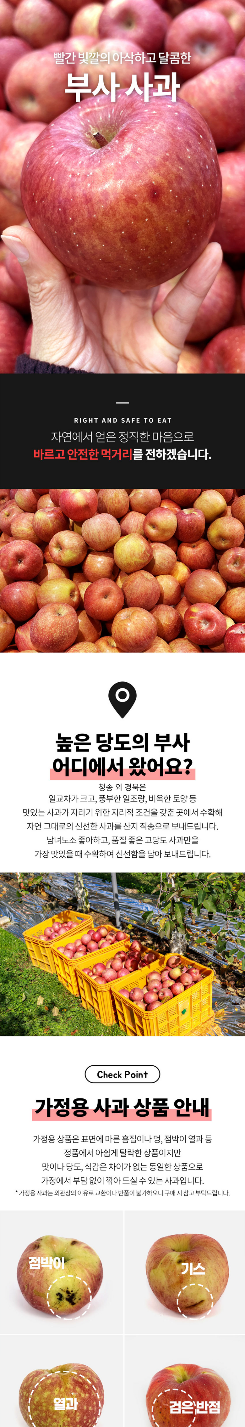 | 품목 또는 명칭 | [긴급사과프로젝트] 부사 사과 청송 달콤아삭 | 포장단위별 내용물의 용량(중량),수량,크기 | 2kg 로얄과, 3kg 로얄과, 5kg 로얄과 |