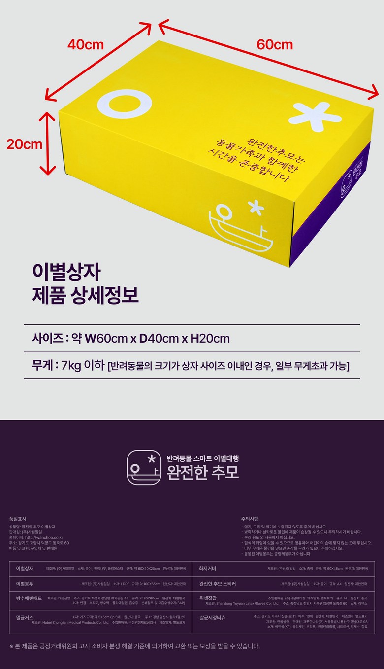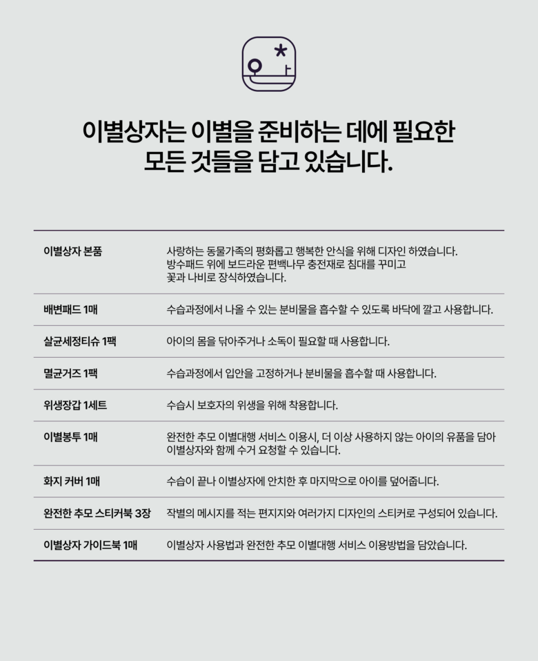 | 품명 및 모델명 | 완전한 추모 이별상자 | 인증/허가 사항 | 해당사항 없음 |