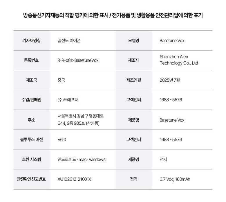 | 품명 및 모델명 | 베이스튠 복스 Basetune Vox | KC 인증정보 | 필증번호 : R-R-d8z-BasetuneVox |