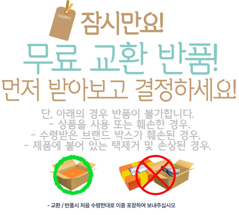 • ㆍ모니터 해상도의 차이로 인해 색상이나 이미지가 실제와 달라, 고객이 단순 변심으로 교환/반품을 무료로 요청하는 경우