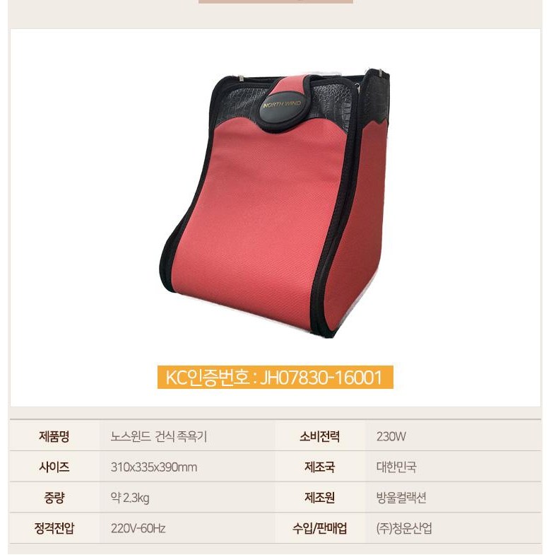 | 품명 및 모델명 | 노스윈드 건식 족욕기 | KC 인증정보 | 상품 상세페이지 참조 |