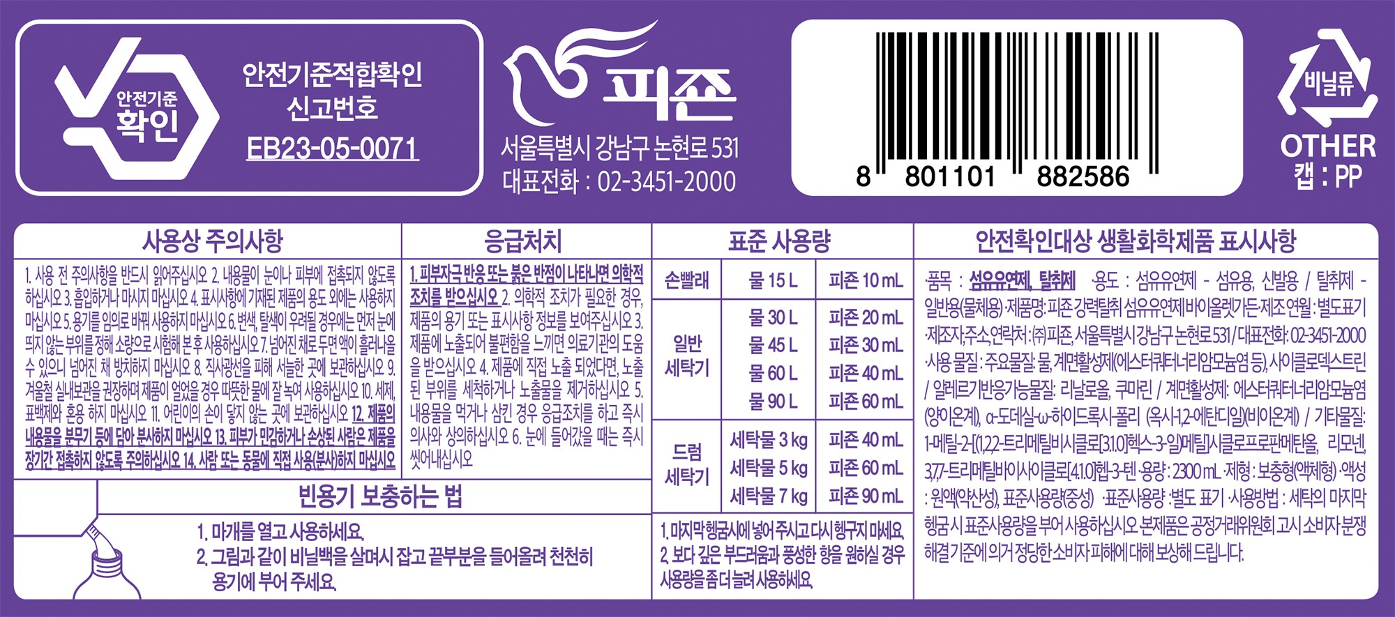 | 품목 및 제품명 | 리뉴얼 전 : 섬유유연제, 탈취제 / 피죤 바이올렛가든_에이 | 리뉴얼 후 : 섬유유연제, 탈취제 / 피죤 강력탈취 섬유유연제 바이올렛가든 | 용도(표백제의 경우 계열을 함께표시) 및 제형 | 섬유유연제 -섬유용,신발용 / 탈취제 - 일반용(물체용)/ 보충형(액체형) |