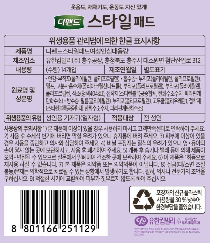 | 품명 및 모델명 | 디펜드스타일패드여성안심대용량 | 인증/허가 사항 | 위생용품 |