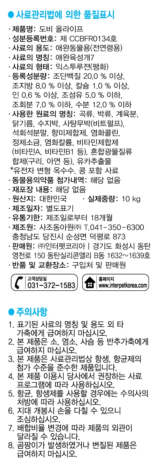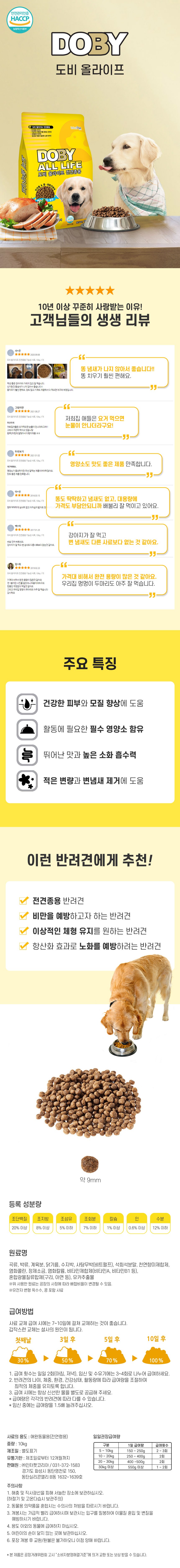 | 품명 및 모델명 | 도비 올라이프 전견종용 | 인증/허가 사항 | 사료관리법에 따른 성분등록번호 : 컨텐츠 참조 |