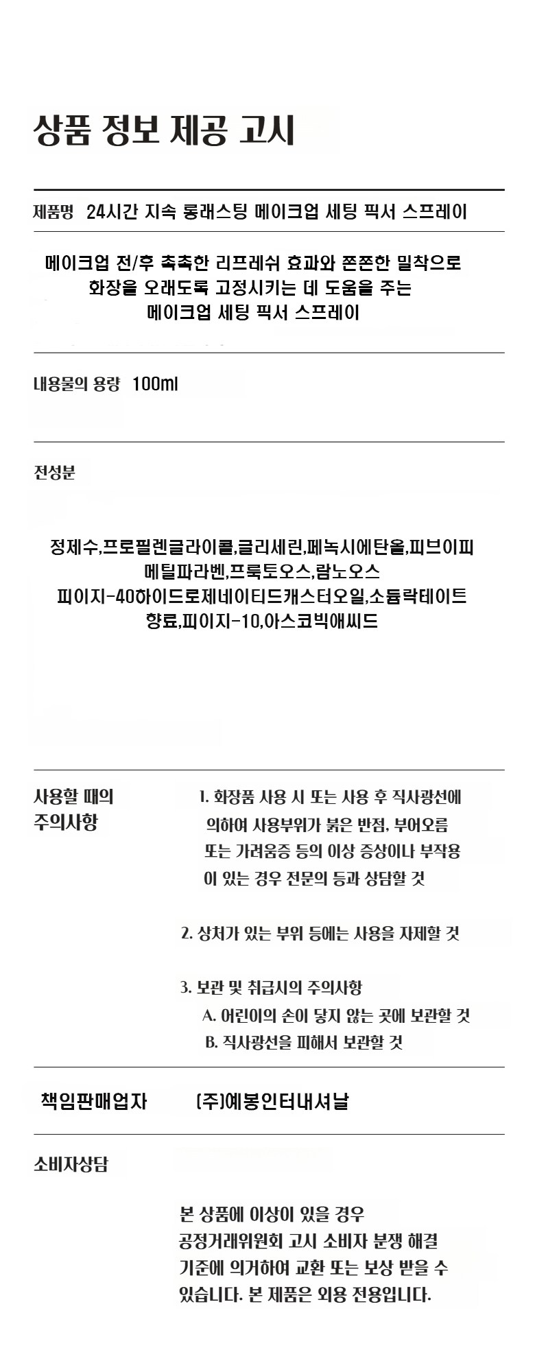 | 화장품제조업자, 화장품책임판매업자 및 맞춤형화장품판매업자 | 판다야/(주)예봉인터내셔날 | 제조국 | 중국 |