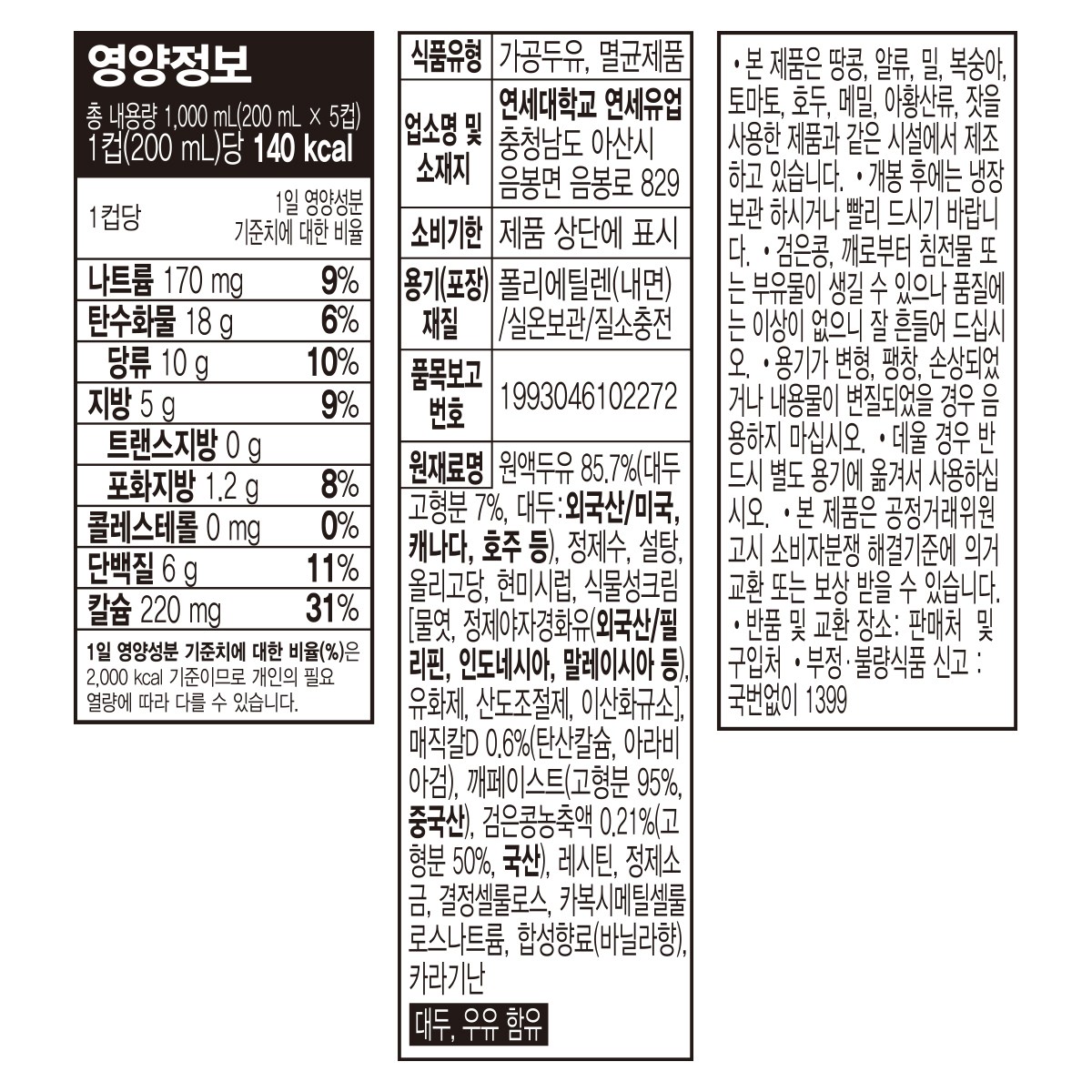 | 제품명 | 고소한 검은콩 앤 고칼슘 두유 | 식품의 유형 | 컨텐츠참조 |