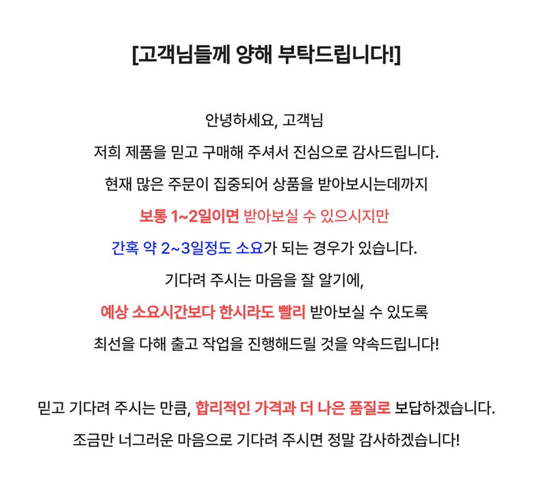 | 배송기간 | ㆍ도서산간 지역 등은 배송에 3-5일이 더 소요될 수 있습니다. - 천재지변, 물량 수급 변동 등 예외적인 사유 발생 시, 다소 지연될 수 있는 점 양해 부탁드립니다. | ||
