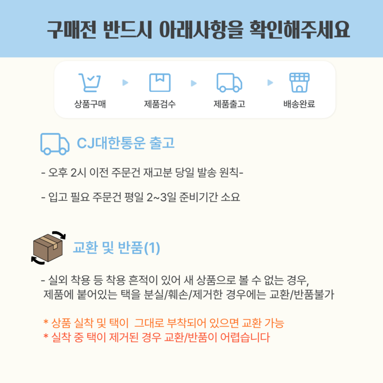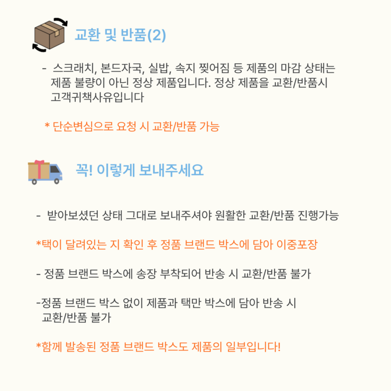 - ㆍ모니터 해상도의 차이로 인해 색상이나 이미지가 실제와 달라, 고객이 단순 변심으로 교환/반품을 무료로 요청하는 경우