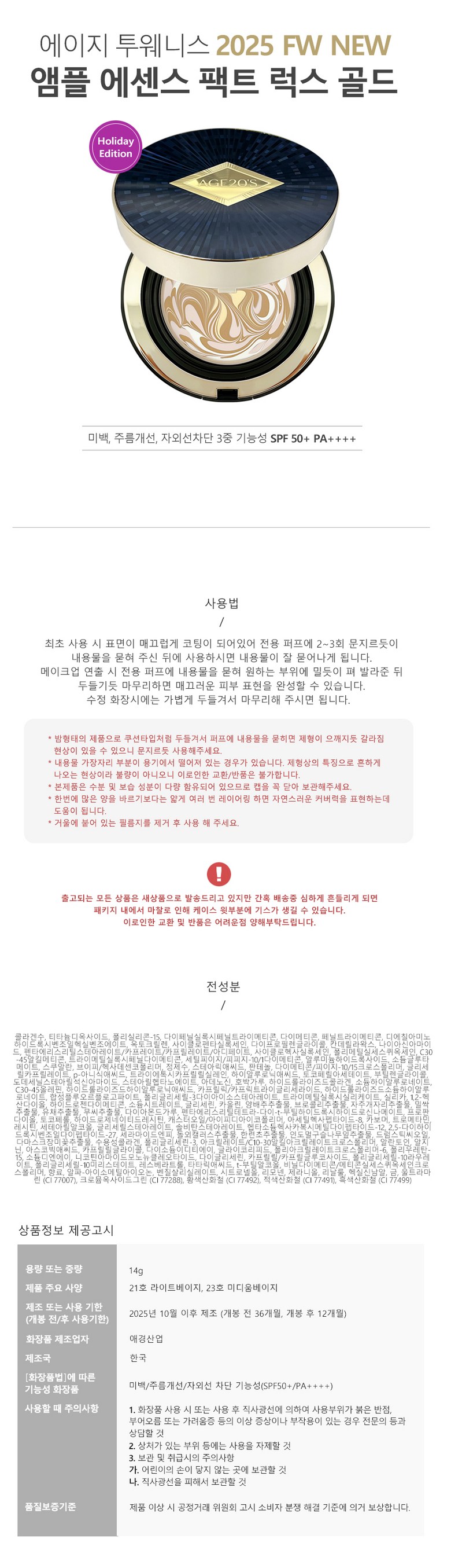 | 화장품제조업자, 화장품책임판매업자 및 맞춤형화장품판매업자 | 상품 상세페이지 참조 | 제조국 | 상품 상세페이지 참조 |