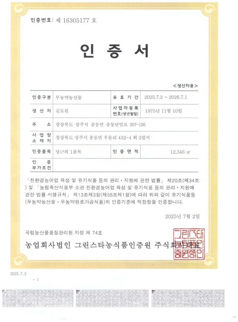 | 생산자(수입자) | 경상북도 상주시 중동면 간상2길 140 | 원산지 | 국내산 |