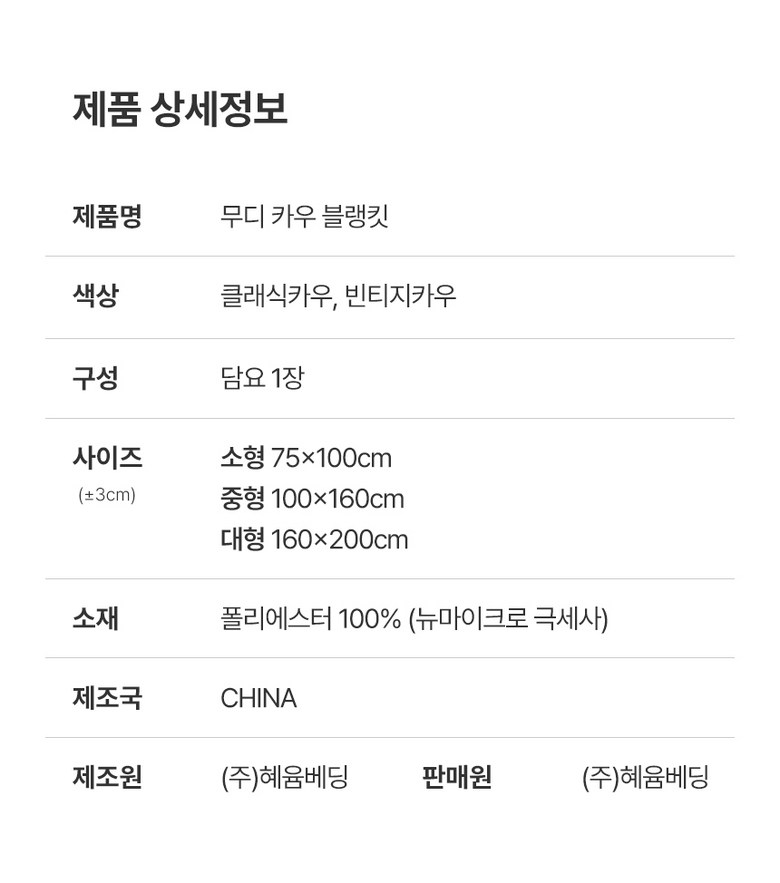 | 제조자(수입자) | ㈜혜윰베딩 | 제조국 | 중국 |