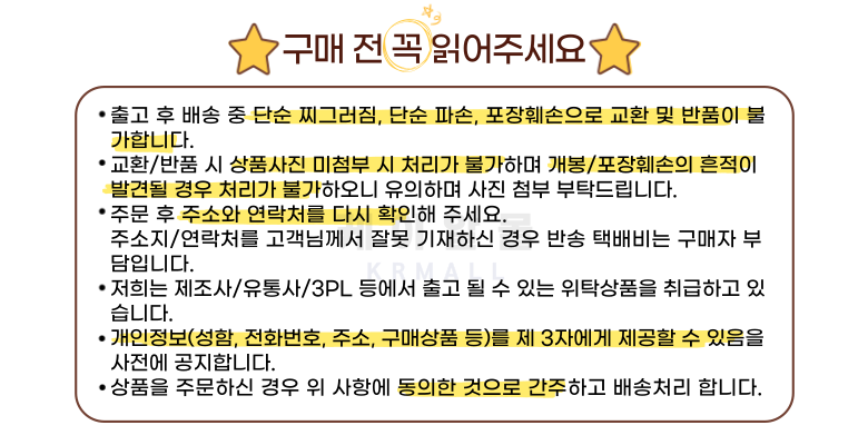 - ㆍ교환/반품에 관한 일반적인 사항은 판매자가 제시사항보다 관계법령이 우선합니다.