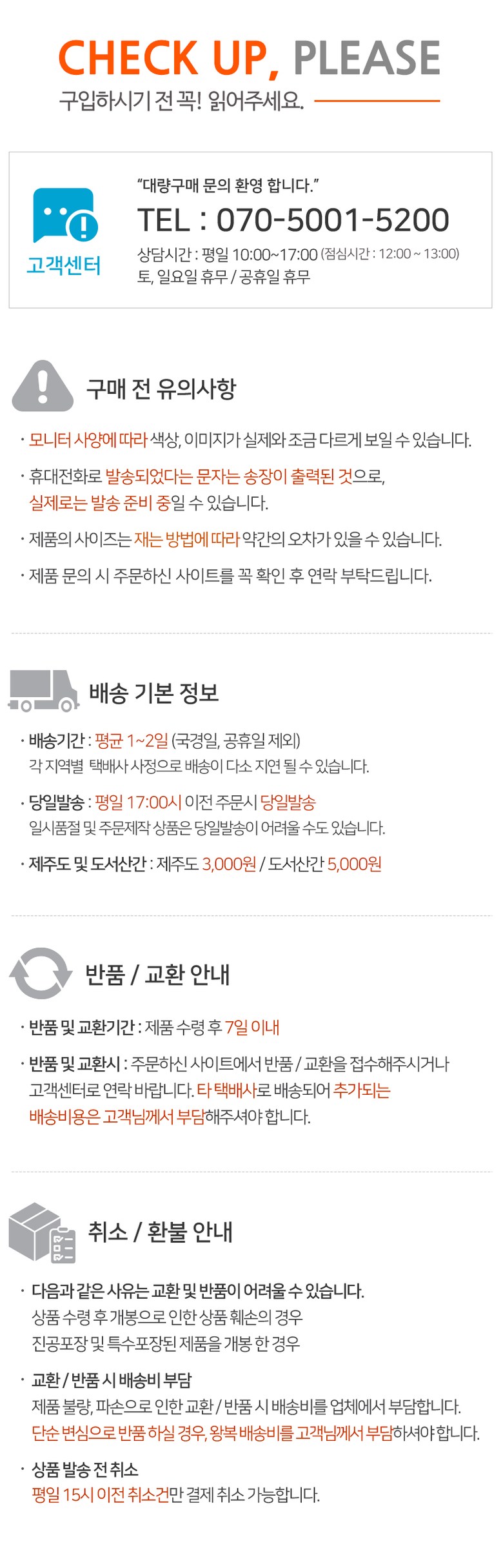 - ㆍ교환/반품에 관한 일반적인 사항은 판매자가 제시사항보다 관계법령이 우선합니다.
