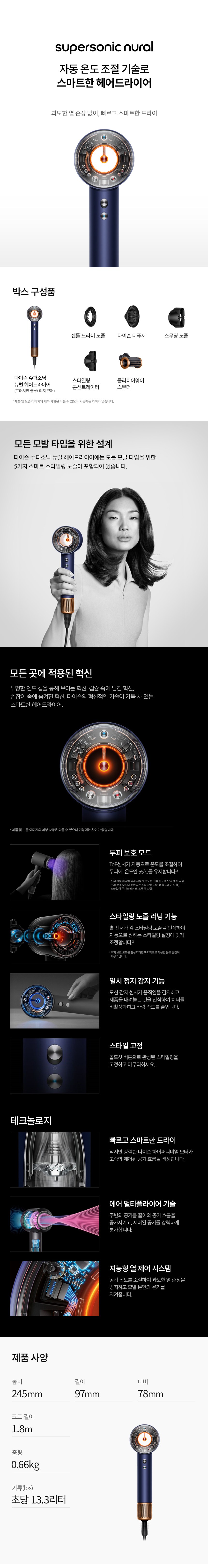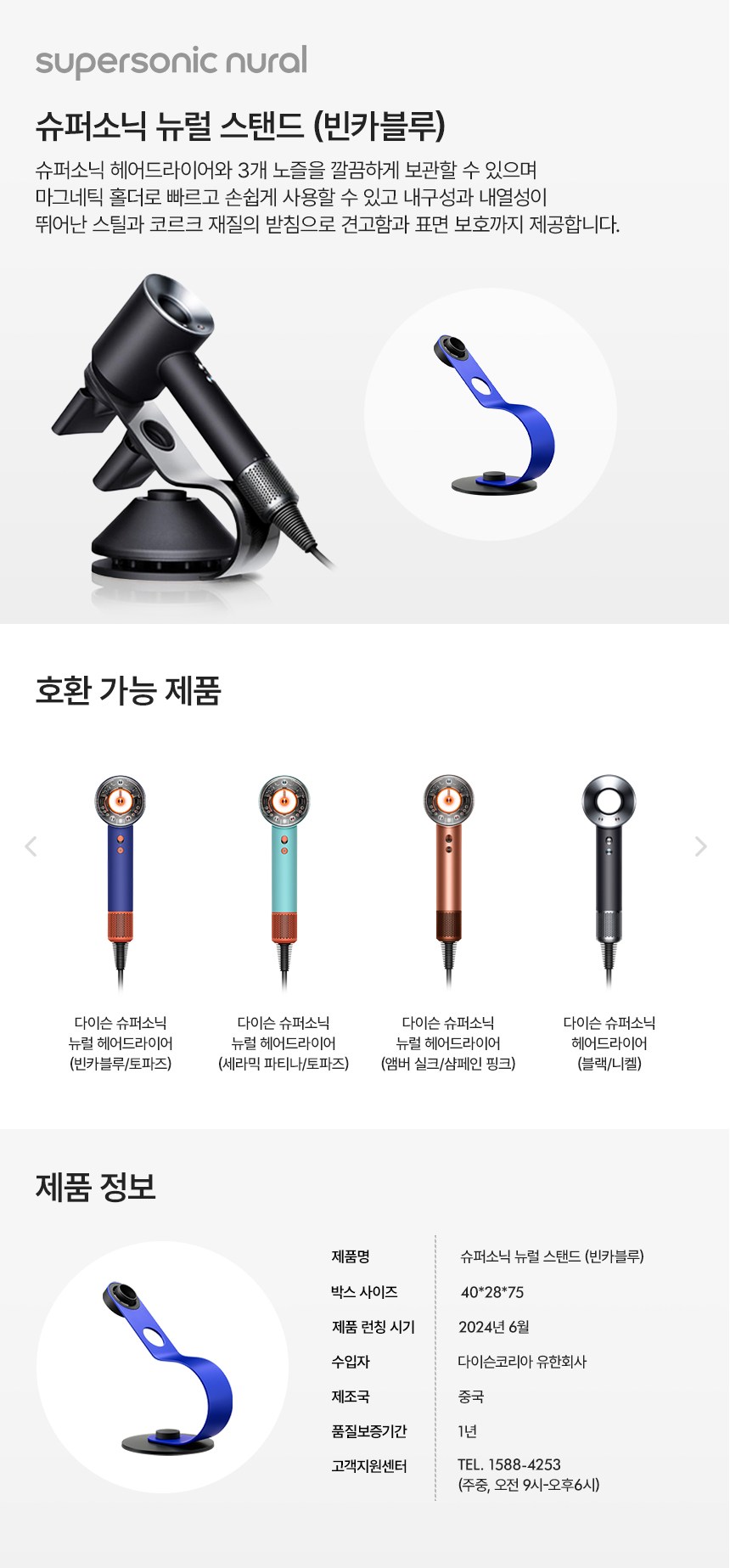 | 품명 및 모델명 | 다이슨 슈퍼소닉 뉴럴 헤어드라이어 / HD16 + 보관케이스 + 스탠드 세트 | KC 인증정보 | HU071855-16001X / MSIP-REI-771-HD01 |