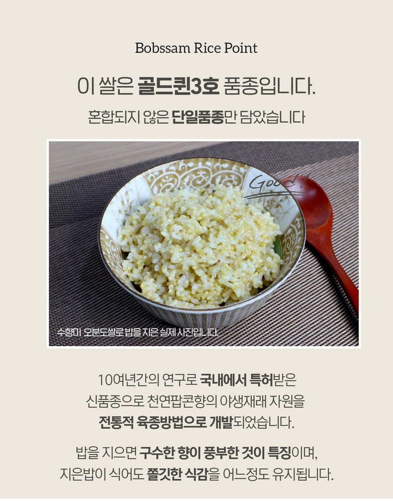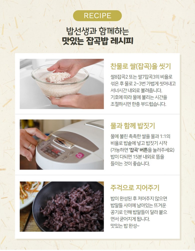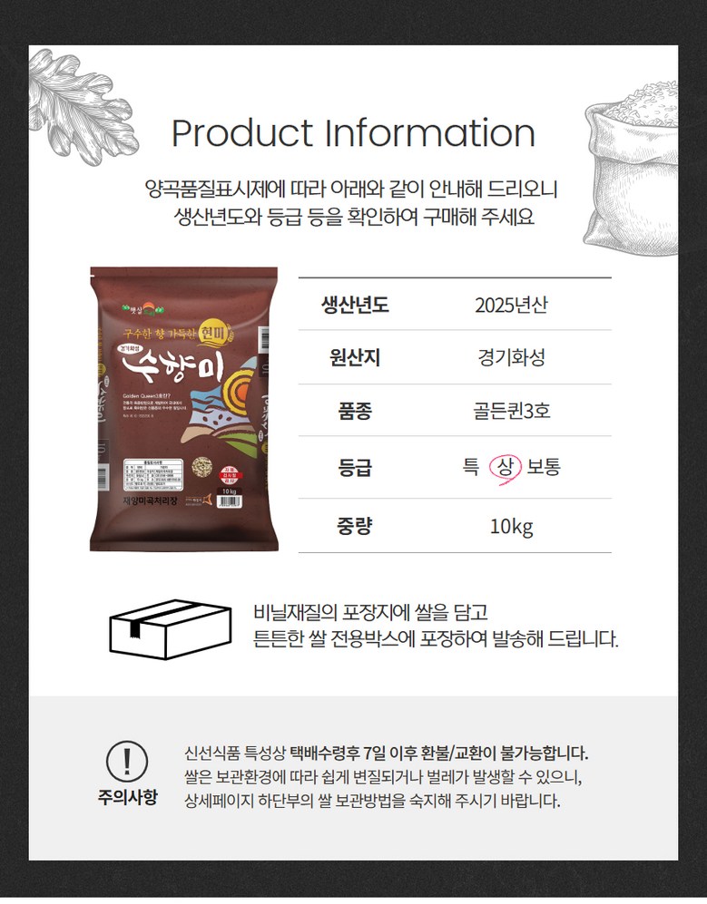 | 제조연월일, 소비기한 또는 품질유지기한 | 생산년도 : 2025년산 / 유통기한 : 곡물은 별도로 유통기한을 표기하지 않으나 가급적 빠른 시일내 섭취해 주세요 | 세부 품목군별 표시사항 | 해당사항 없음 |