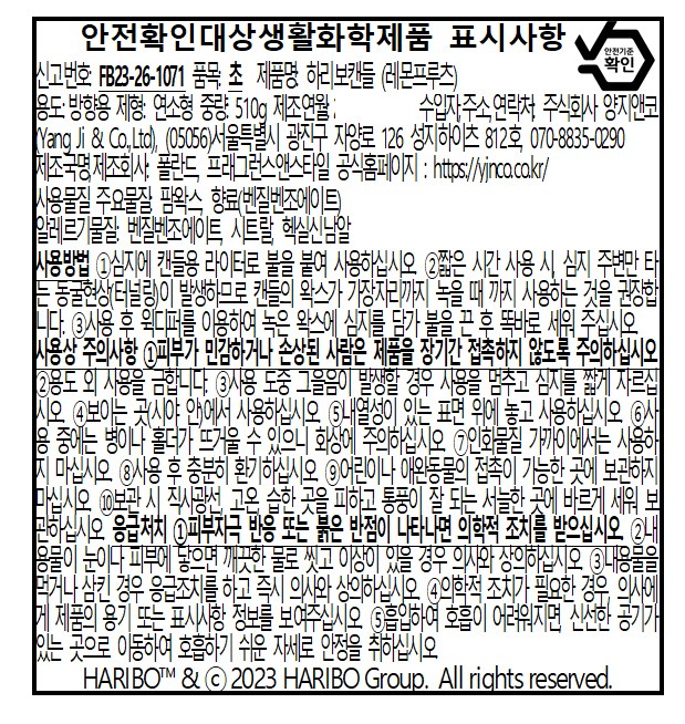 | 품목 및 제품명 | 초 / 하리보캔들 (레몬프루츠) | 용도(표백제의 경우 계열을 함께표시) 및 제형 | 방향용/연소형 |
