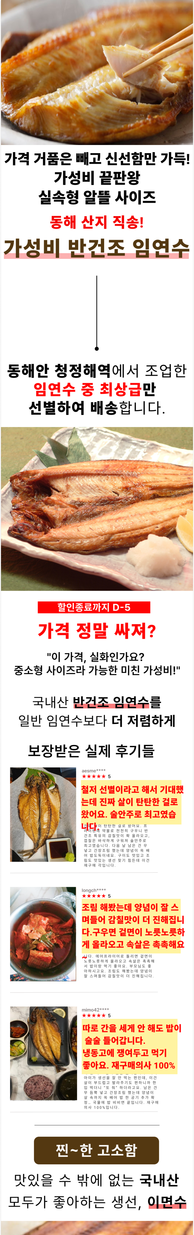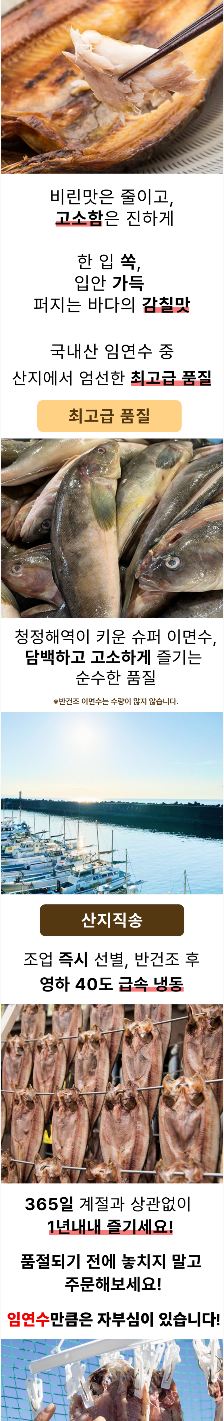 | 품목 또는 명칭 | [가성비최고] 바삭촉촉 국내산 반건조 임연수 | 포장단위별 내용물의 용량(중량),수량,크기 | 반건조 임연수 6미 (2미 1팩 x 3개_630g 내외), 8미 (2미 1팩 x 4개_840g 내외), 12미 (2미 1팩 x 6개_1.3kg 내외), |