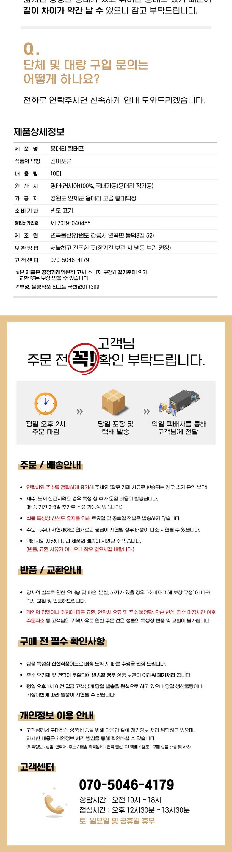 | 품목 또는 명칭 | 황태포 44-47cm 10마리 | 포장단위별 내용물의 용량(중량),수량,크기 | 황태포 44-47cm 10마리 |