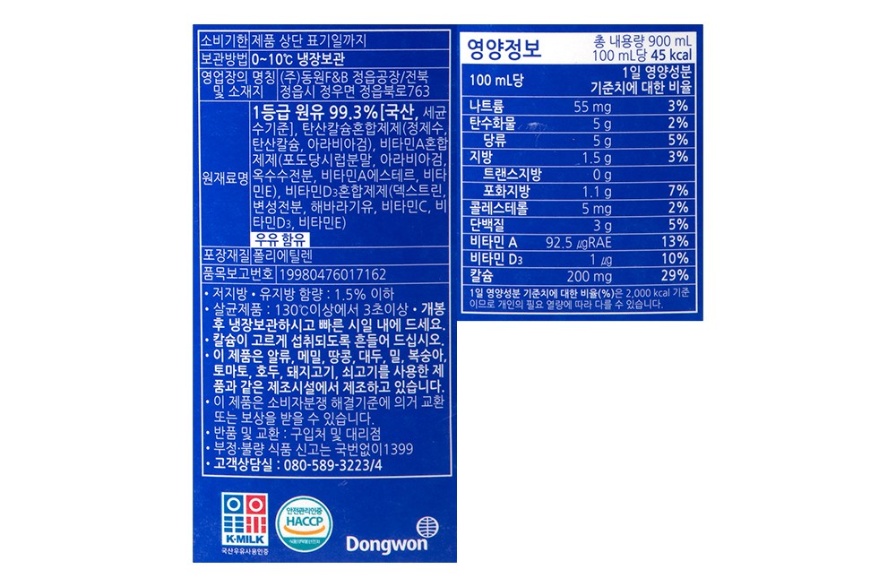| 제품명 | 고칼슘 우유 | 식품의 유형 | 강화우유 |