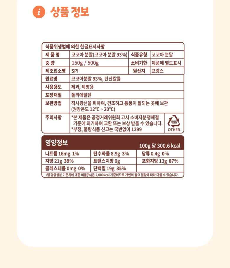 | 제품명 | 발로나 무가당 코코아파우더 100% 무설탕 카카오파우더 | 식품의 유형 | 코코아분말 |