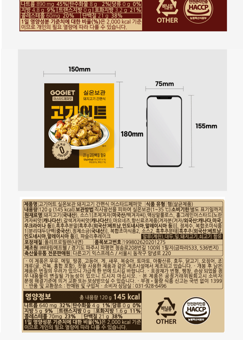| 제품명 | 고기어트 실온보관 돼지고기 간편식 | 식품의 유형 | 햄류 |