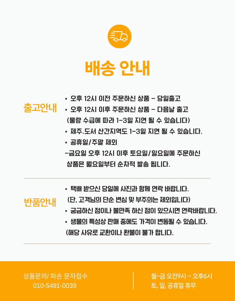| 제조연월일, 소비기한 또는 품질유지기한 | 생산년도:제조연월일: 주문일로부터 3일이내유통기한: | 세부 품목군별 표시사항 | <농산물>1) 유전자 변형농산물 표시 -2) 지리적표시 -<수산물> 1) 유전자 변형수산물 표시 -2) 지리적표시 -<축산물>1) 등급 표시 -2) 이력관리 표시 유무 - |