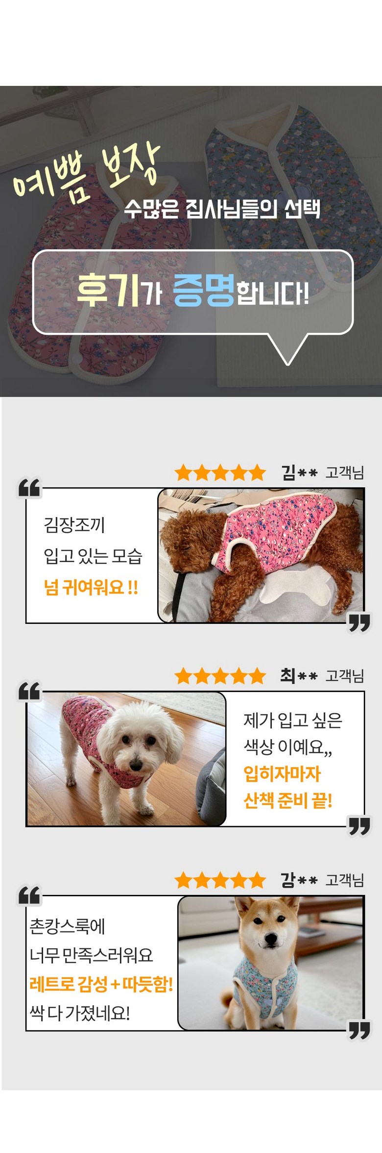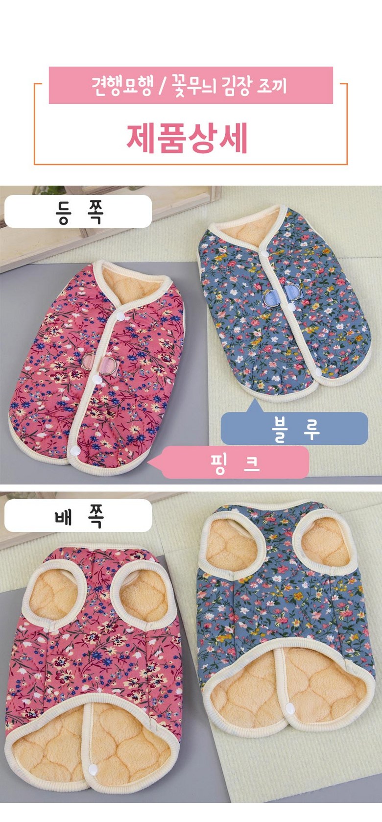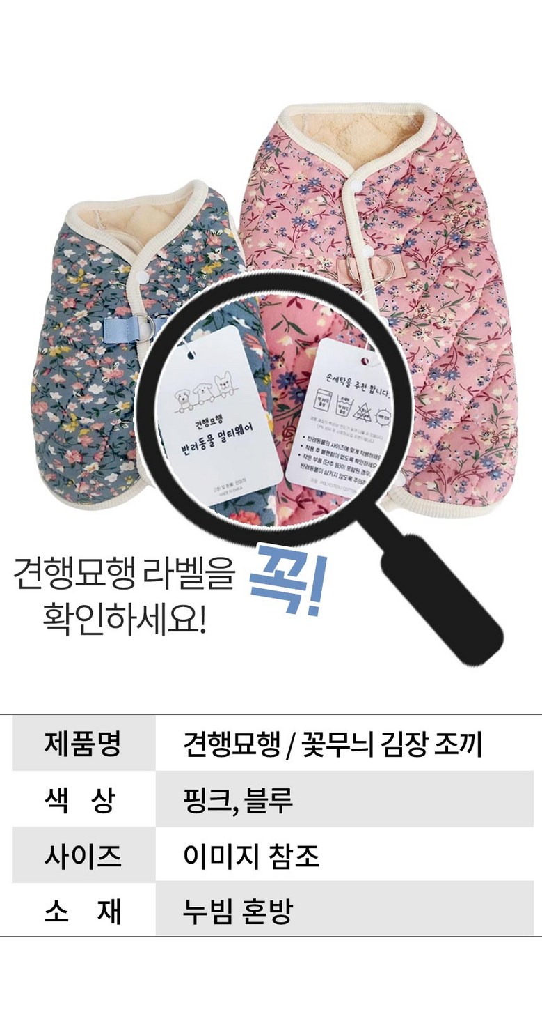 | 품명 및 모델명 | 견행묘행 강아지 김장 조끼 꽃무늬 겨울옷 | 인증/허가 사항 | 해당사항없음 |