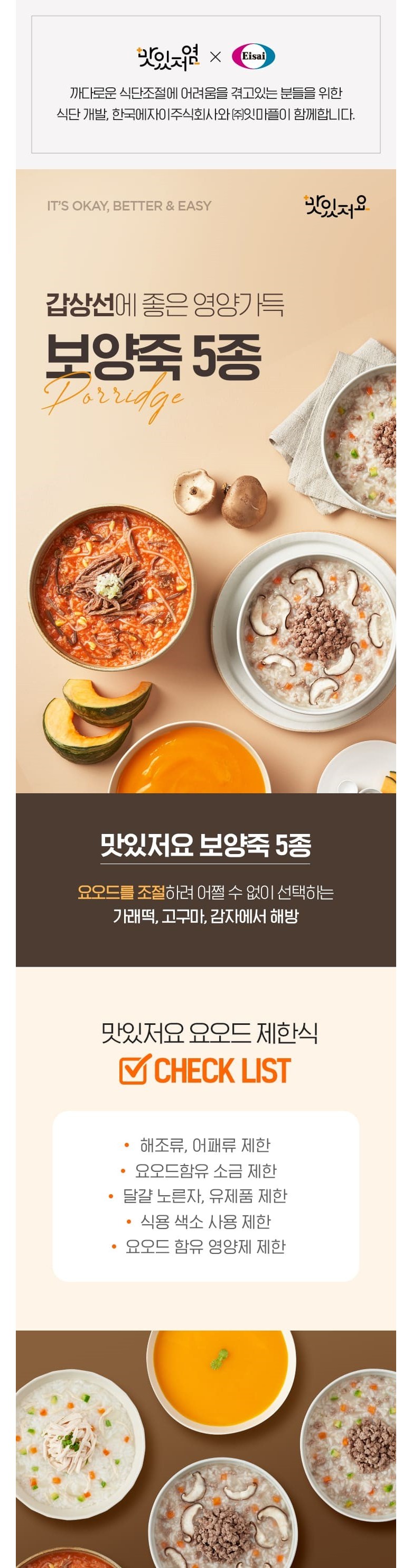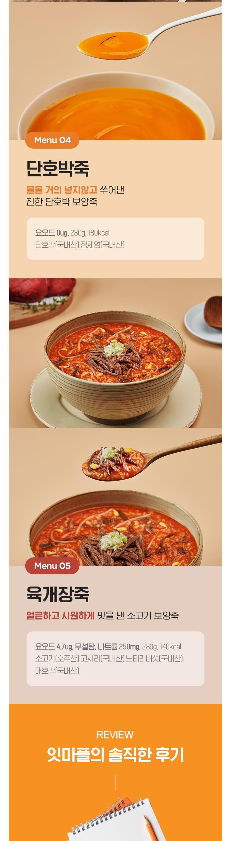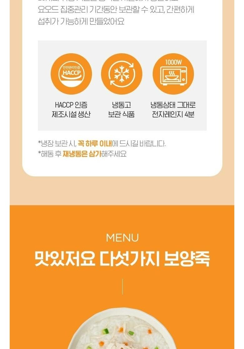 | 제품명 | 소고기버섯죽,소고기야채죽,닭고기야채죽,단호박죽,육개장죽 | 식품의 유형 | 즉석조리식품(가열하여 섭취하는 냉동식품) |