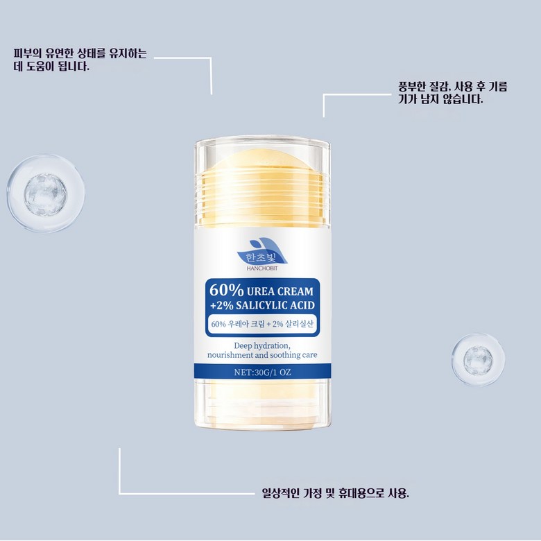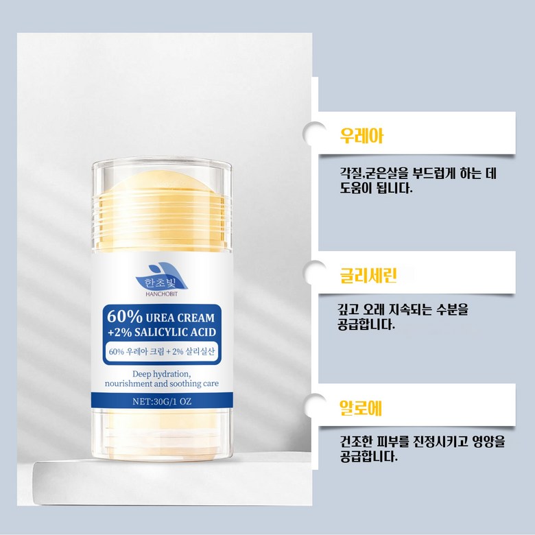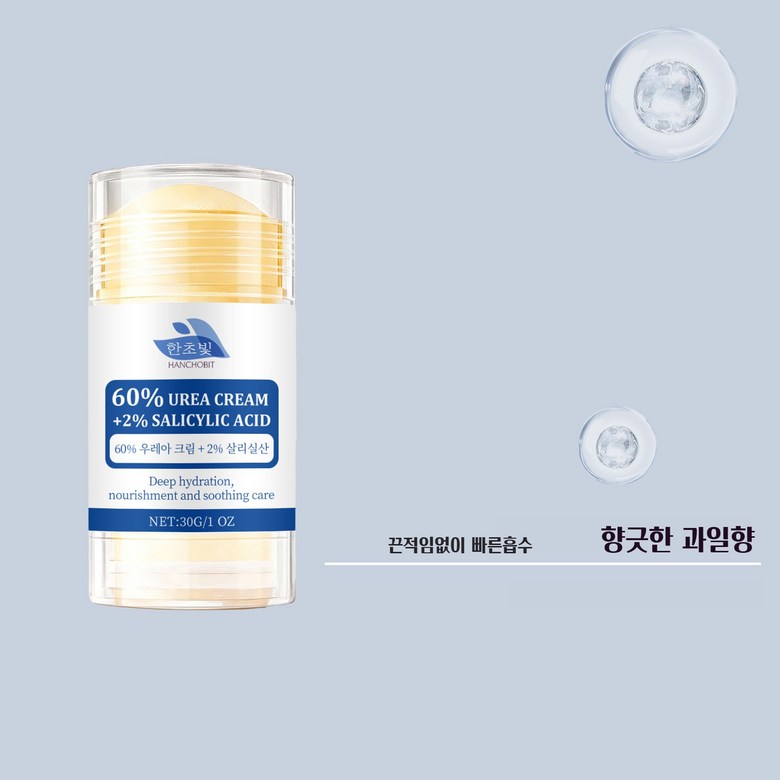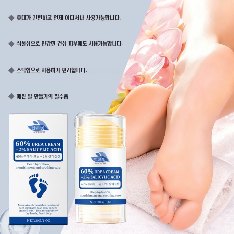 | 품명 및 모델명 | 한초빛 60%우레아크림 2%살리실산 풋크림스틱 | 인증/허가 사항 | MFDS |