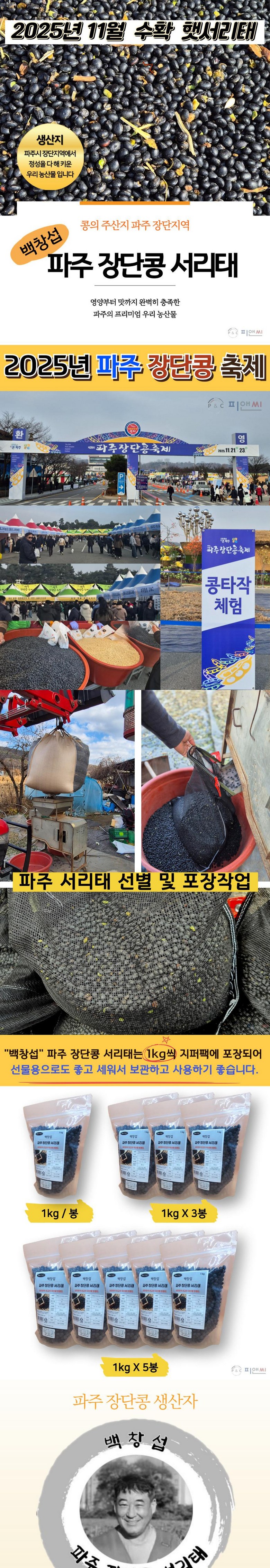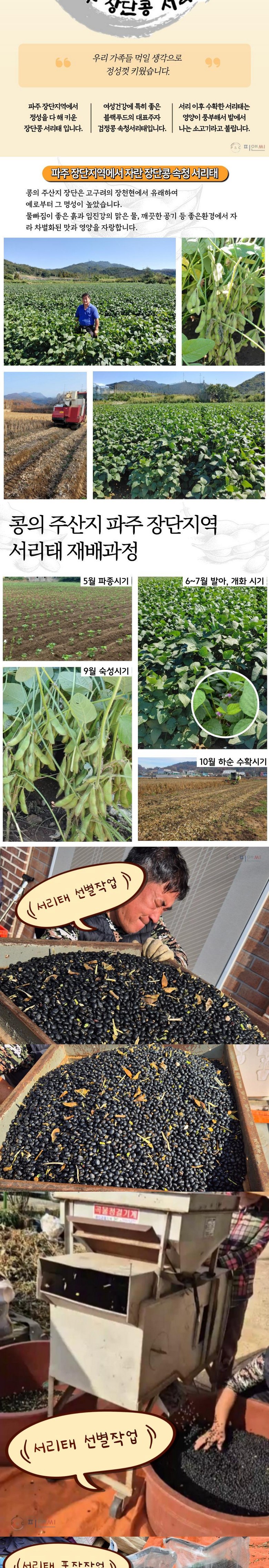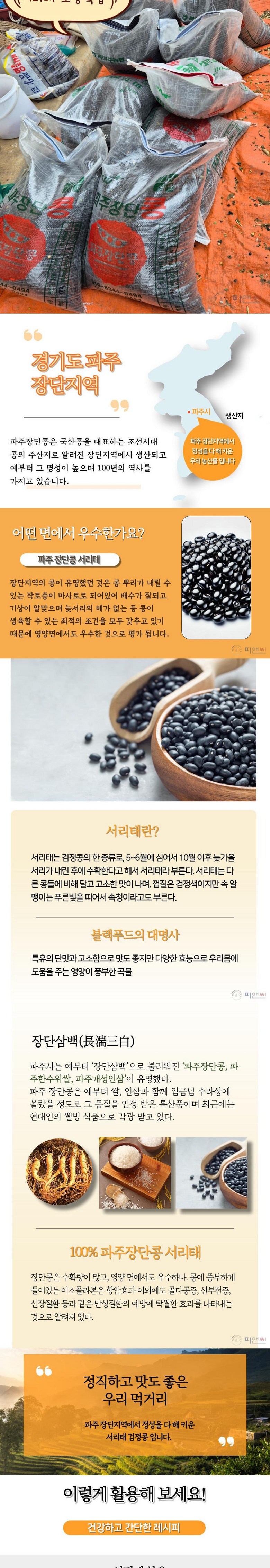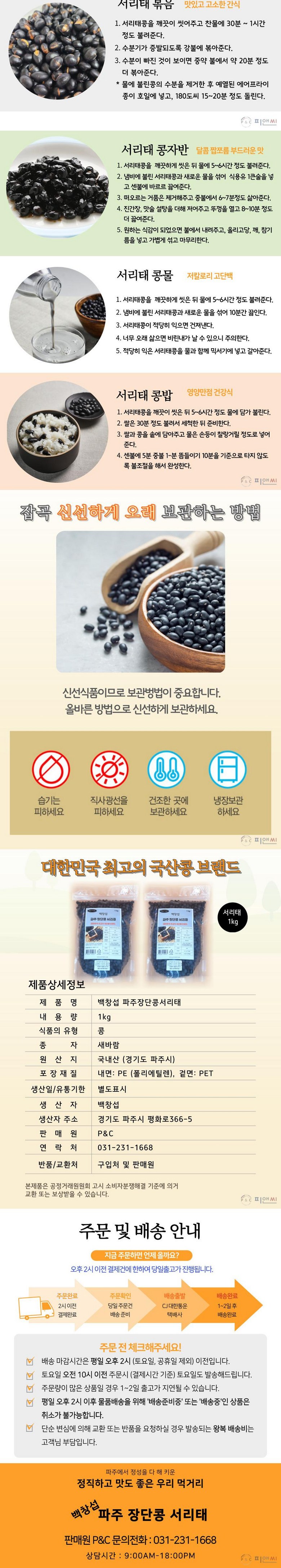 | 품목 또는 명칭 | 백창섭 파주장단콩서리태 | 포장단위별 내용물의 용량(중량),수량,크기 | 기본 500g / 봉 |