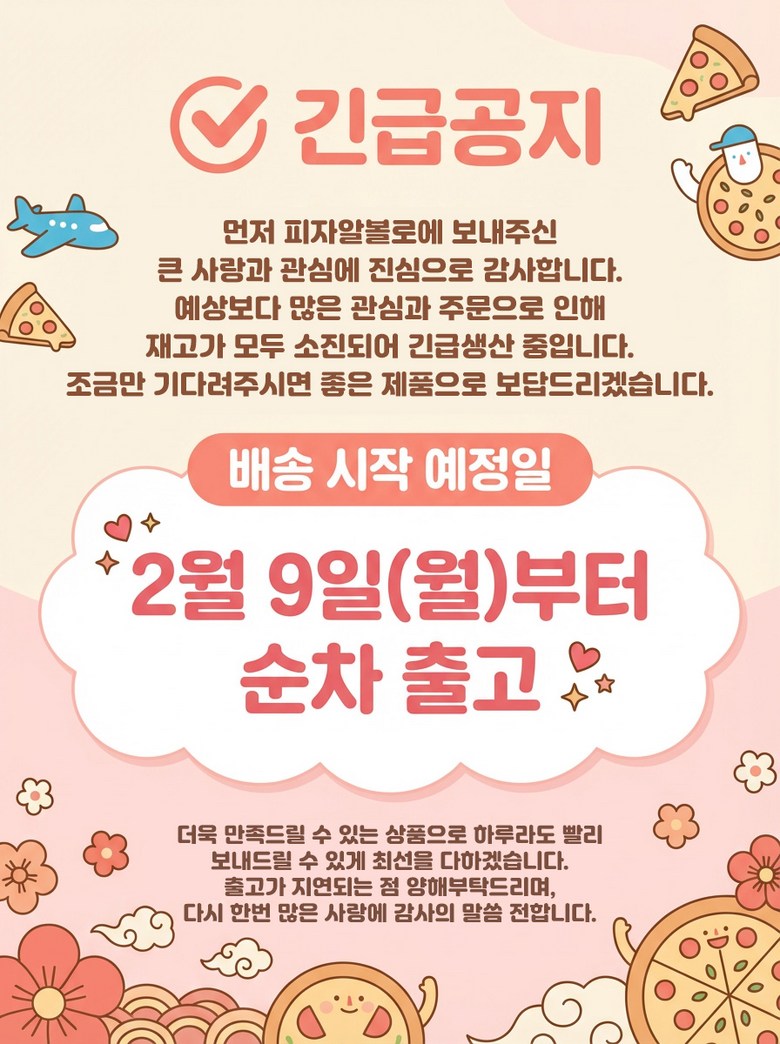 | 생산자 및 소재지 | 피자코리아 / 인천광역시 남동구 호구포로 111 | 제조연월일, 소비기한 또는 품질유지기한 | 주문일 기준 6개월이내 제조 상품 / 제조일로부터 12개월 |