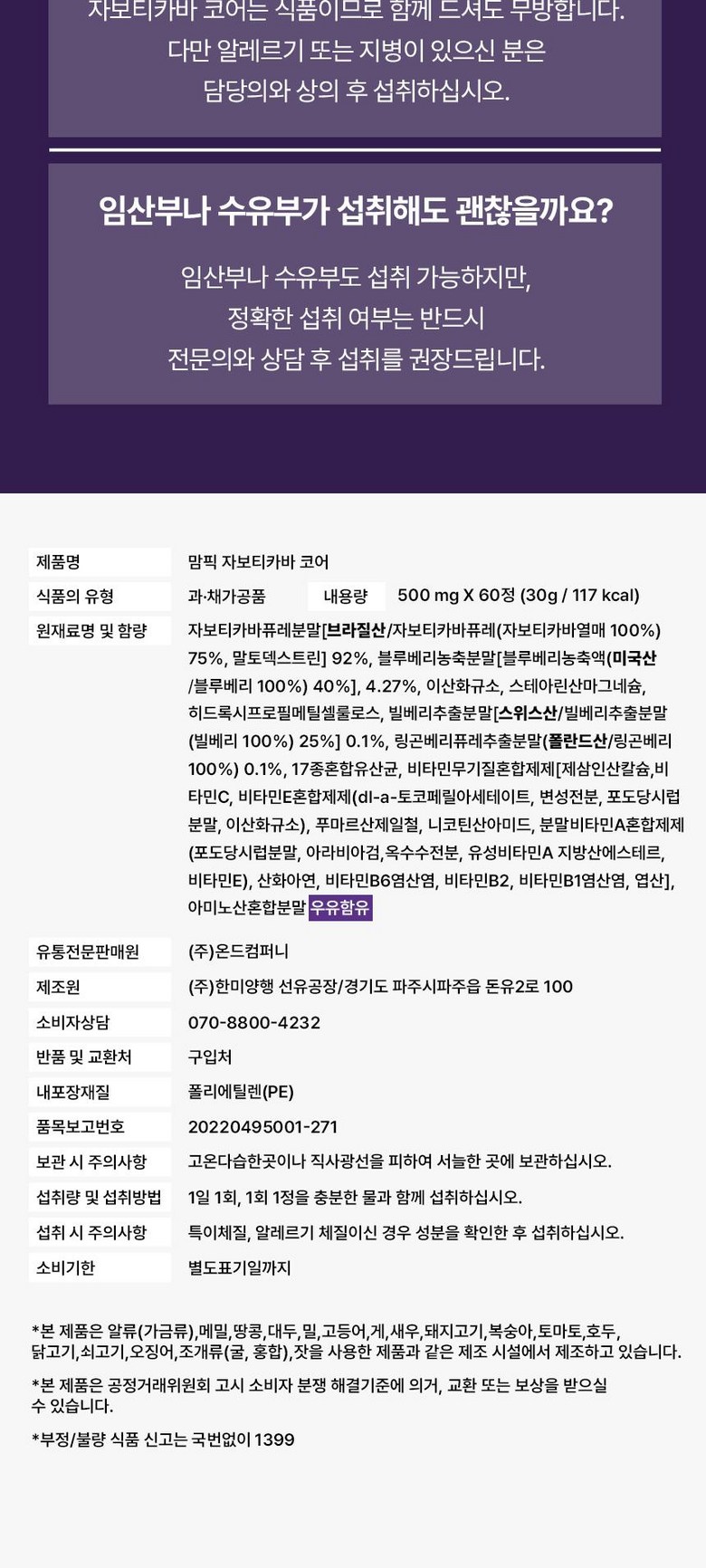 | 제조연월일, 유통기한 또는 품질유지기한 | 상세페이지 참조 | 포장단위별 용량(중량), 수량 | 500mg x 60정 (30g) |